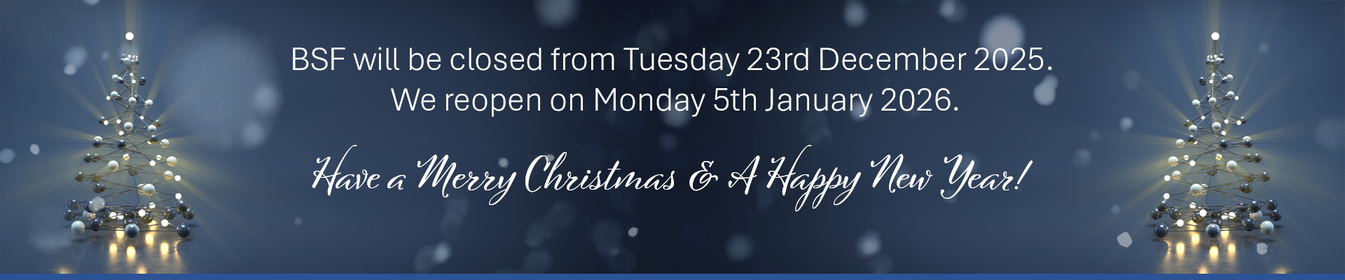 ALT TEXT BSF will be closed from Tuesday 23rd November. We reopen on Monday 5th January 2026 at 8.30am.